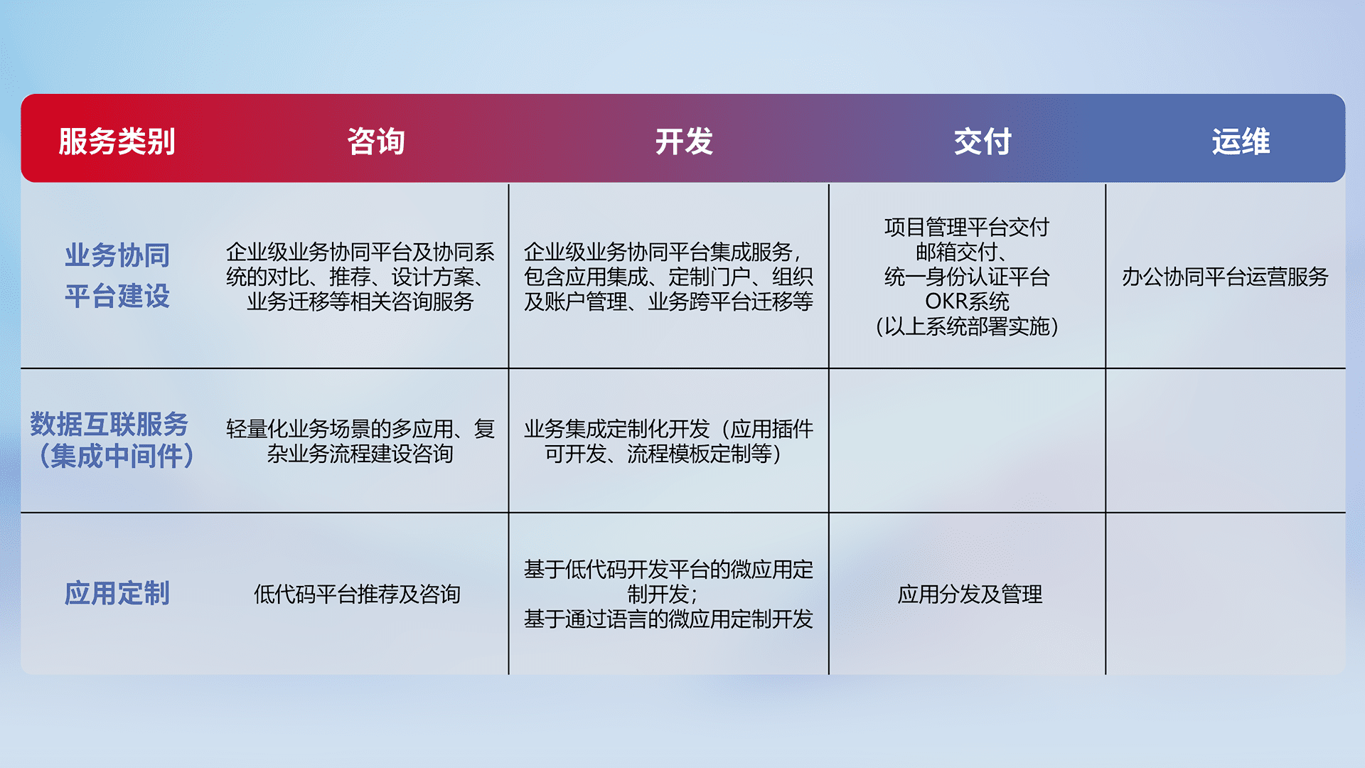 针对钉钉、、、、企微、、、IDaas等平台级产品提供产品的规划、、方案、、、、交付、、、定制化开发等服务,,实现如统一协同办公、、智能客户服务、、混合会议管理、、、智能数据查询、、、、等业务场景,,,,实现数字化转型。。。