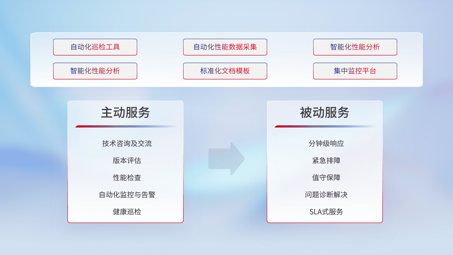 智能化工具和标准化文档,,保障服务质量,,,,提供主动服务(包含技术咨询、、版本评估、、、、性能检查、、自动化监控与告警、、健康巡检)和被动服务包含(分钟级响应、、、紧急排障、、、、值守保障、、、、问题诊断解决、、SLA服务)。。
