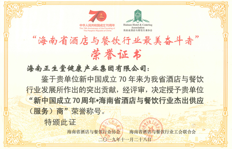 “海南省酒店与餐饮行业最美奋斗者”荣誉证书